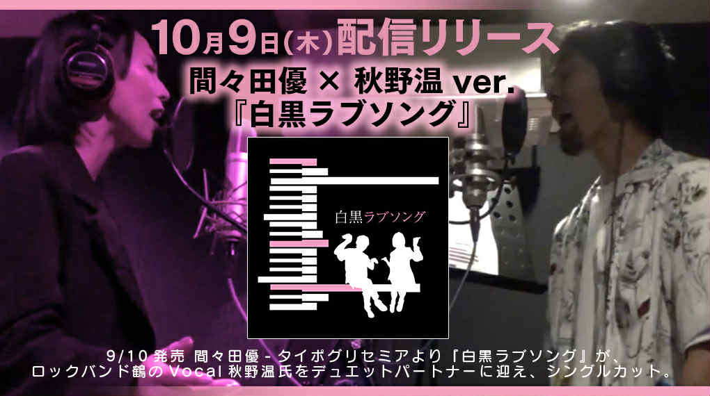 9/10(水)リリースされた間々田優5年ぶりのフルアルバム「タイポグリセミア」から「白黒ラブソング」が10/9(木)デュエットバージョンでデジタルシングルリリースされる。